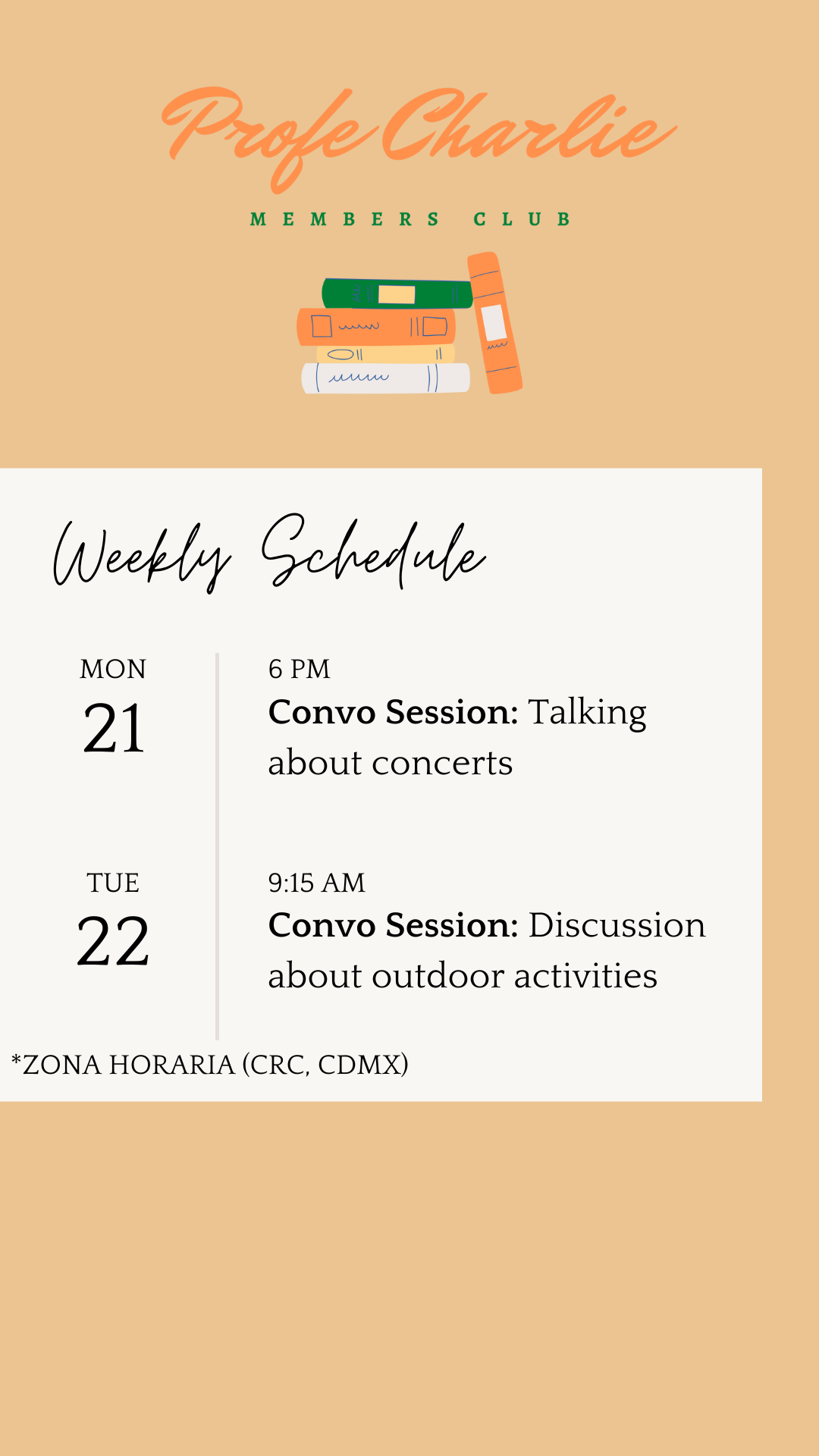 This week we have two conversation sessions: on Monday we’ll talk about concerts and on Tuesday we’ll talk about outdoor activities.