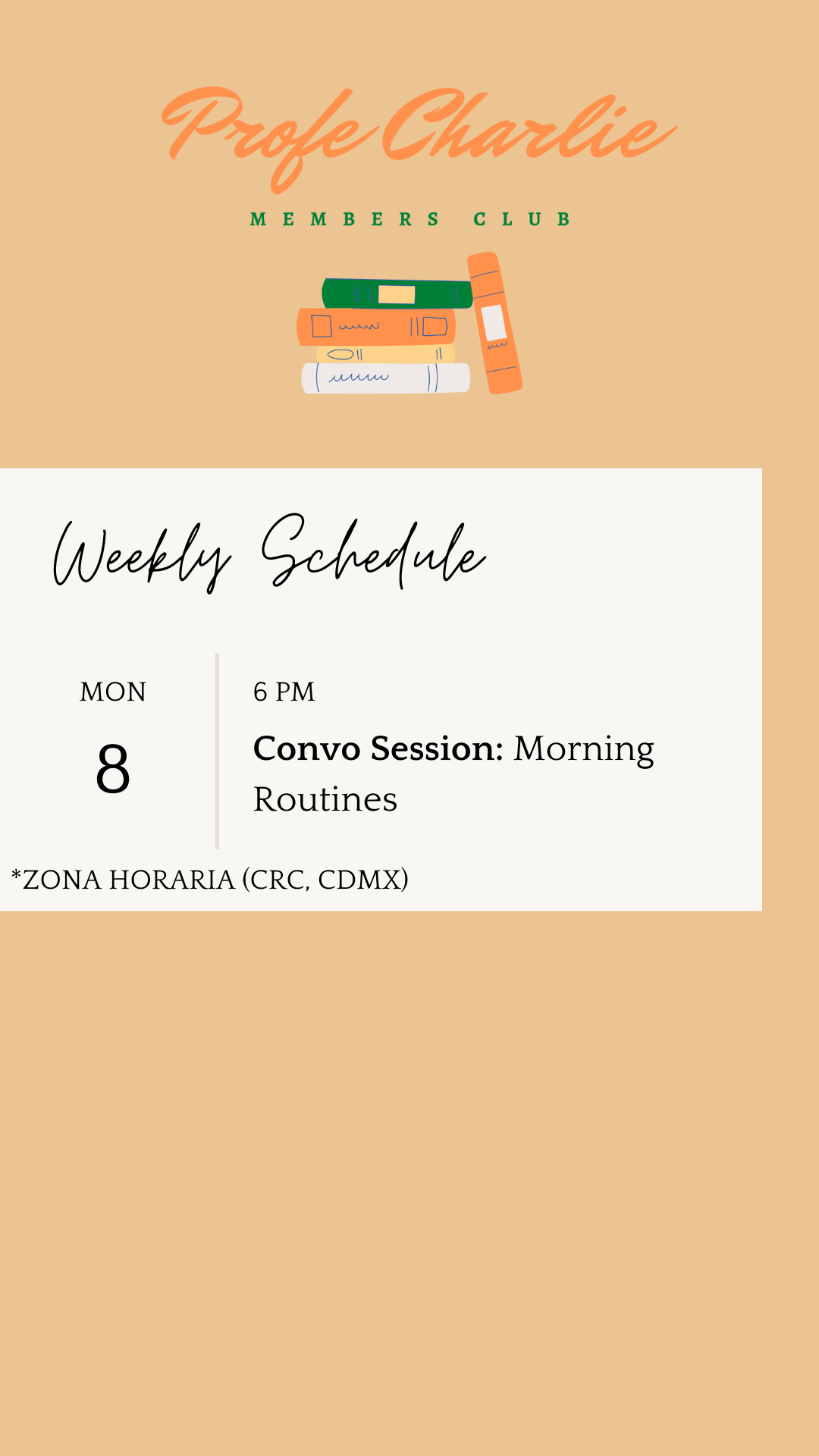 This week we’ve got just one session, our Monday night Convo Club. We’ll talk about morning routines.